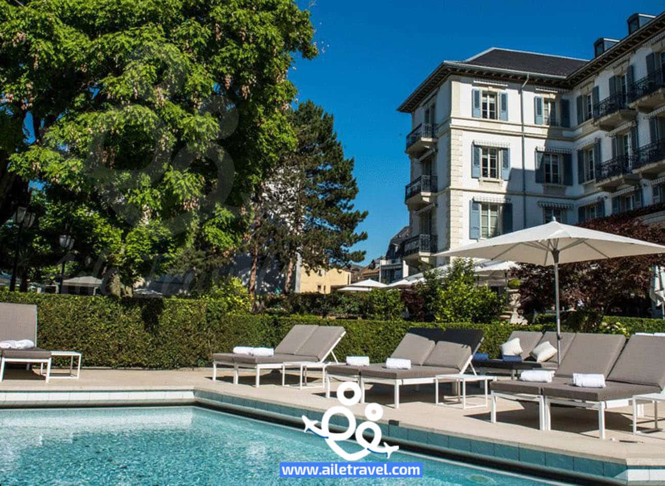 يقع هذا الفندق على شاطئ بحيرة جنيف ، ويوفر إطلالات رائعة على الجبال.